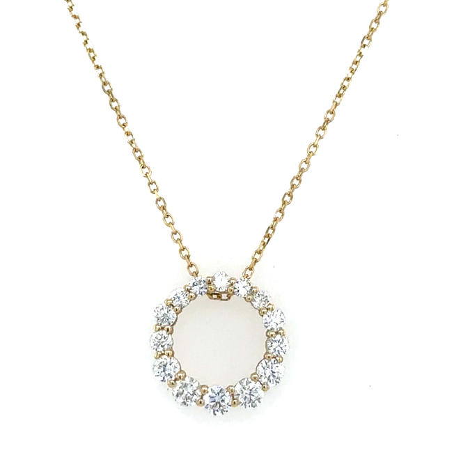 14K Yellow Gold Circle Pendant with 14K Yellow Gold Cable Link Necklace set with Round-shape Diamond H-I Color SI Clarity . This necklace's total carat weight is .65ctw.