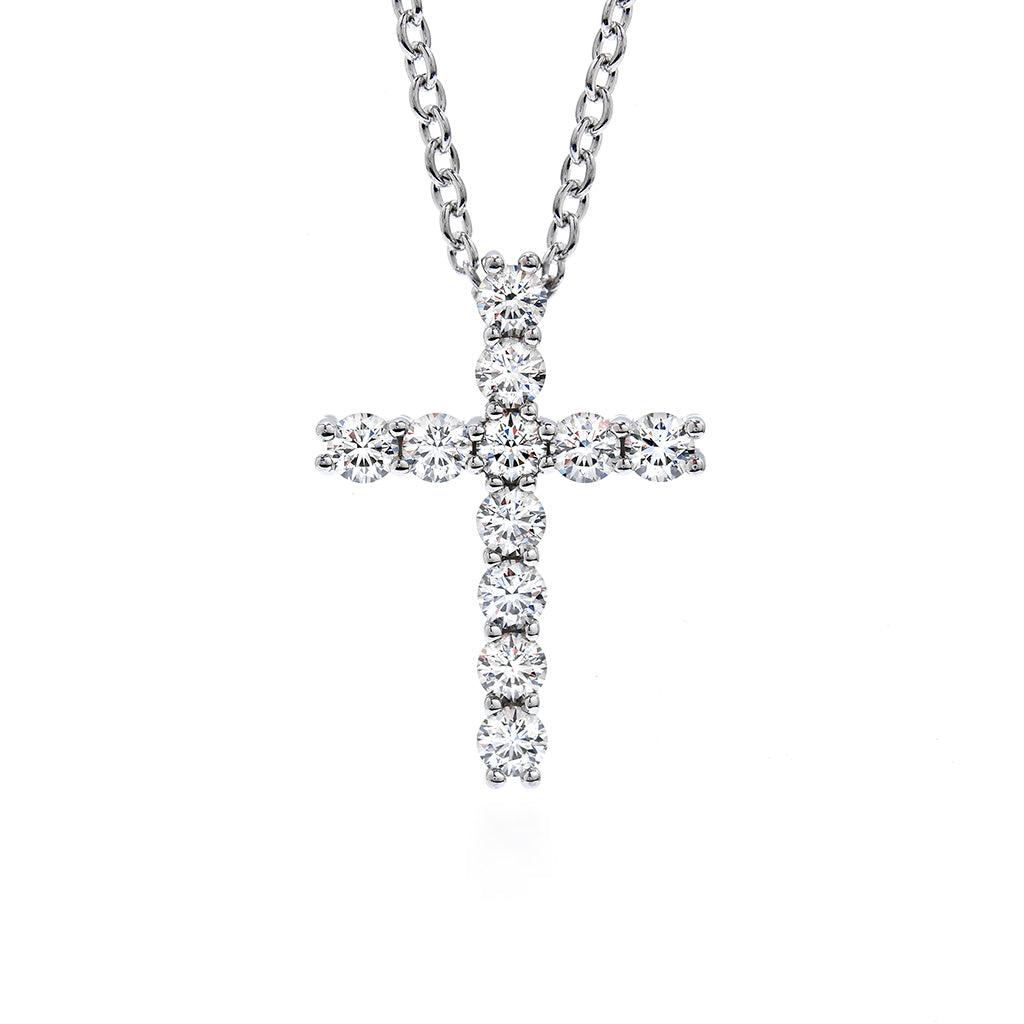 Hearts On Fire 18K White Gold Cross Pendant with 18K White Gold Necklace set with 11 Round-shape Diamonds (0.16ct) I-J Color SI Clarity . This necklace's total carat weight is .16ctw.