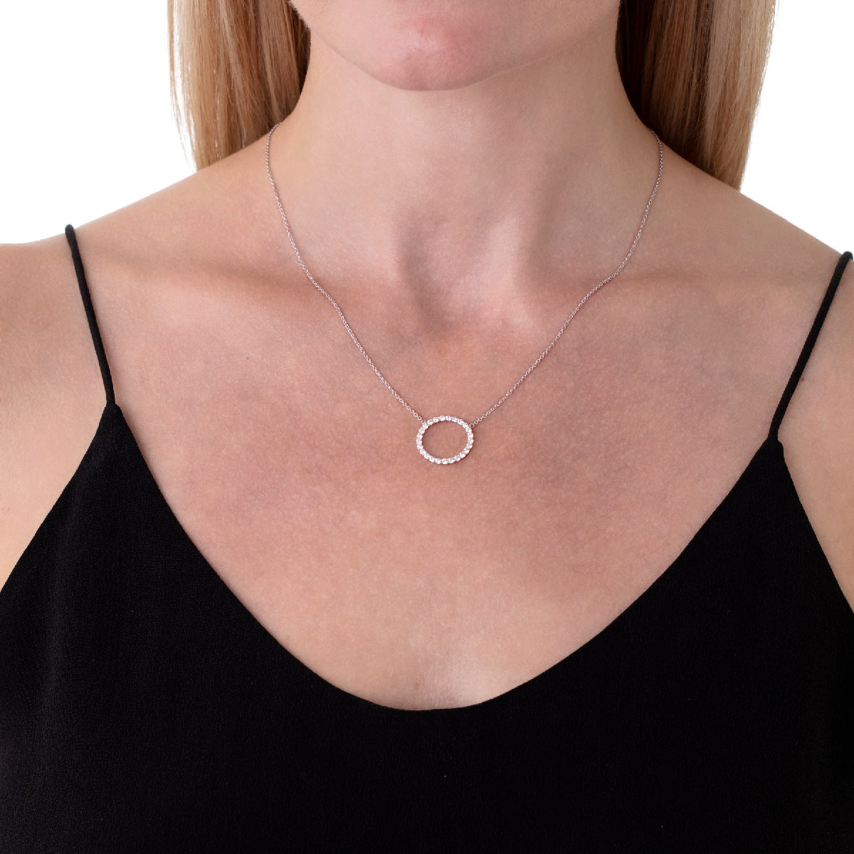 Hearts On Fire 18K White Gold Circle Pendant with 18K White Gold Link Necklace set with 25 Round-shape Diamonds G-H Color SI Clarity . This necklace's total carat weight is 0.65ctw.