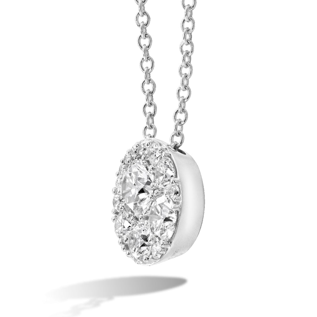 Hearts On Fire 18K White Gold Cluster Pendant with 18K White Gold Necklace set with Round-shape Diamond G-H Color SI Clarity . This necklace's total carat weight is .50ctw.
