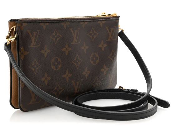 PreOwned Louis Vuitton Reverse Monogram Giant Double Zip Pochette. This stylish clutch is crafted of giant and classic Louis Vuitton monogram on coated canvas in brown. This bag features black leather trim, an optional adjustable leather shoulder strap and gold hardware. The top zipper opens to a black microfiber interior with a leather patch pocket with card slots.