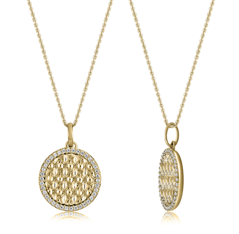 A. JAFFE 14K Yellow Gold Disk Pendant with 14K Yellow Gold Cable Link Necklace set with 38 Round-shape Diamonds G Color SI Clarity . This necklace's total carat weight is .19ctw.