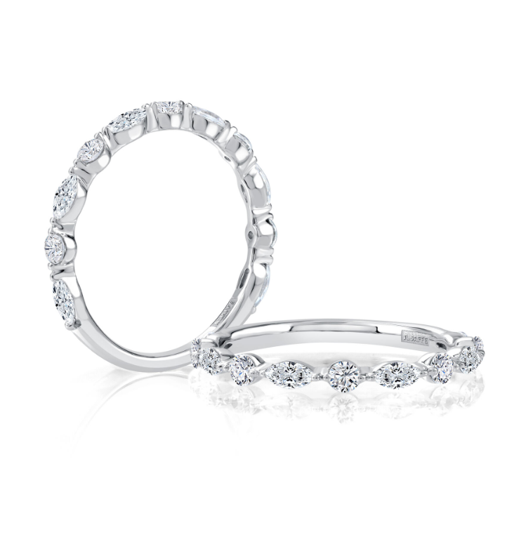 A. JAFFE Half Anniversary Diamond Wedding Ring in 14K White Gold set with 6 Marquise-shape Diamonds (0.42 ctw) G-H Color SI Clarity and also set with 5 Round Diamonds (0.25 ctw) G-H Color SI Clarity.