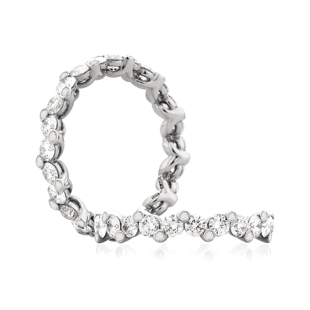 Elegant and romantic, this "bubble" diamond wedding band from A.JAFFE is simply stunning. Hand crafted in 14k white gold, this beautiful diamond band has beautiful round diamond set like little droplets of sparkle around her entire finger. Pair it perfectly with any engagement ring to create a unique and intriguing look or add it to your wedding band stack. Available to special order in platinum, rose gold or yellow gold in your exact finger size.