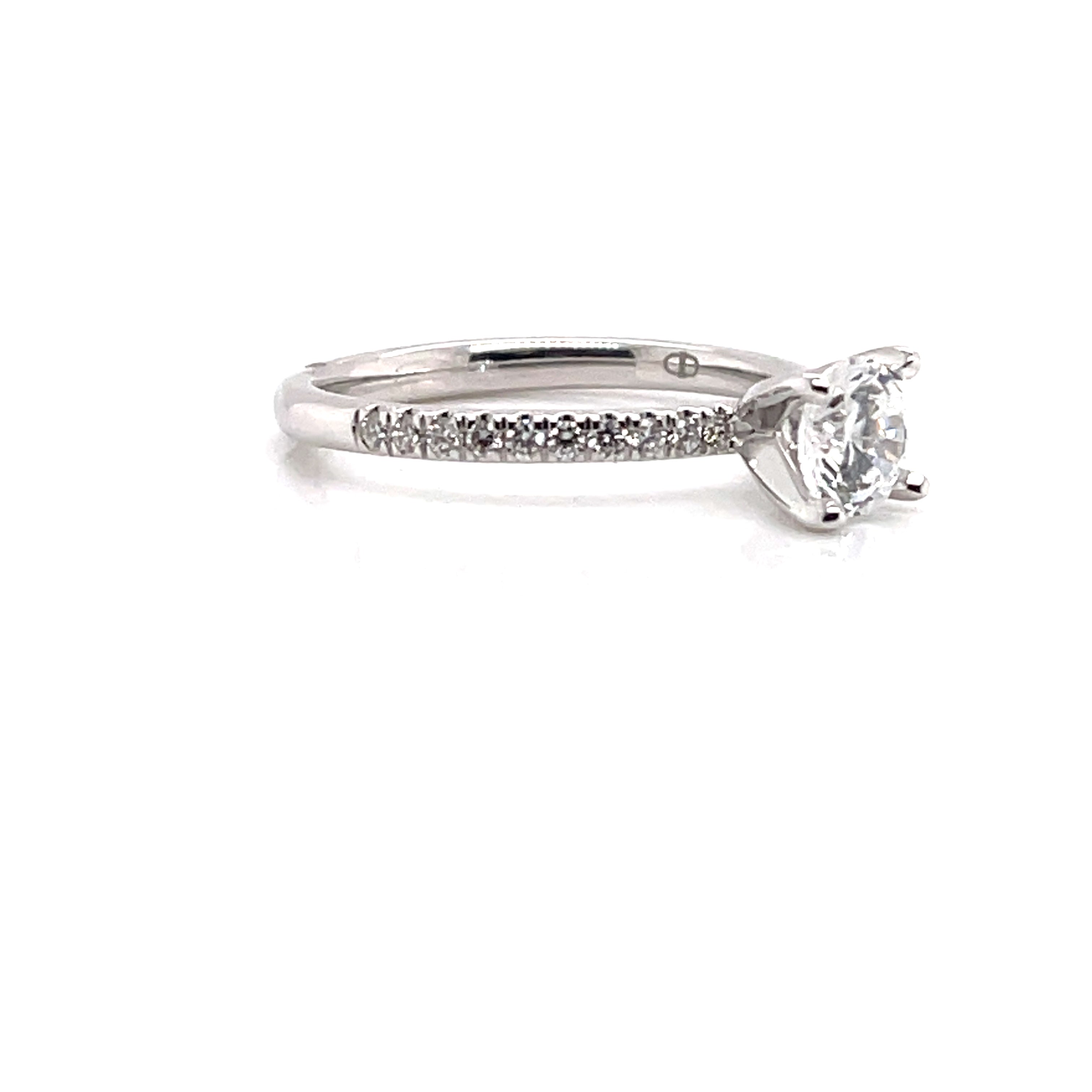 14K White Gold Side Stone Diamond Engagement Ring Setting designed to hold a 0.75 carat 5.8mmX5.8mm Round shape center stone and set with 20 Round-shape side Diamonds (0.20ctw) G-H Color I1 Clarity.