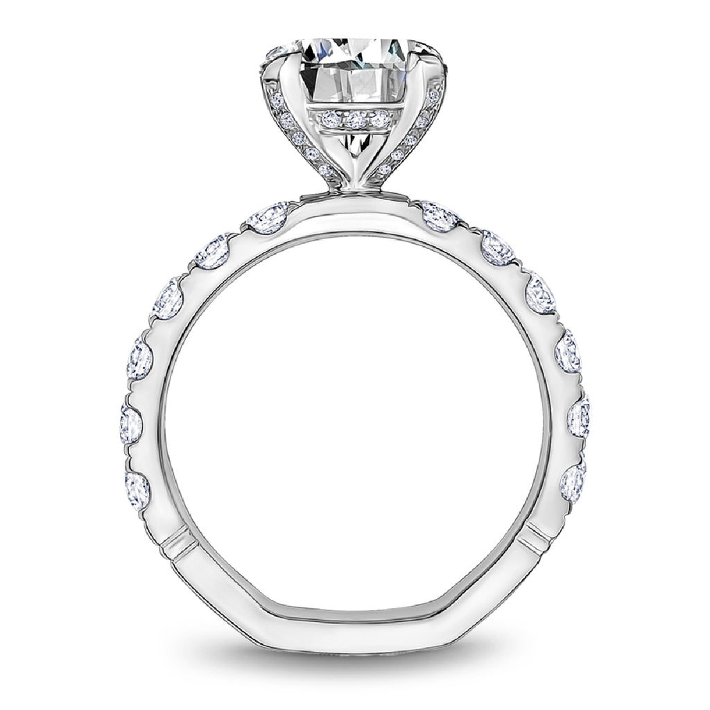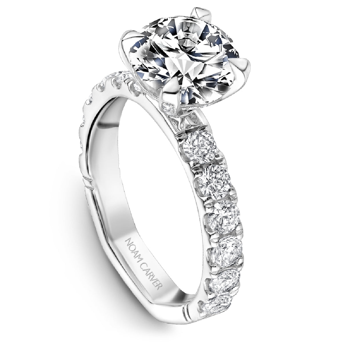 Noam Carver 14K White Gold Side Stone Diamond Engagement Ring Setting designed to hold a 2.50 carat Round shape center stone and set with 48 Round-shape side Diamonds (1.10ctw) F-G Color VS1 Clarity.