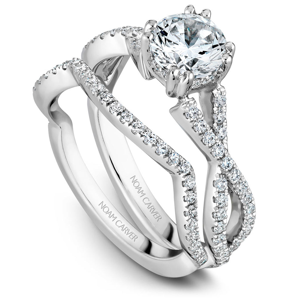 Each Noam Carver diamond engagement ring setting is designed with impeccable attention to every detail, navigating the delicate balance of timeless designs with intriguing allure. This classic, open twist diamond engagement ring features double prongs on the center diamond with even more diamonds glimmering down each side. This ring can be customized to fit your finger size, metal preference, center gemstone size and shape, as well as modified in design to fit your exact specifications. Shown here with a one-carat round replacement stone in 14k white gold with 0.35ctw in side diamonds. Noam Carver, an ode to the past with an eye for tomorrow. Each Noam Carver engagement ring pairs with an exact matching wedding band.