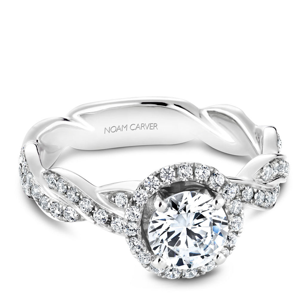 Each Noam Carver engagement ring setting is designed with impeccable attention to every detail, navigating the delicate balance of timeless designs with intriguing allure. This classic, round halo engagement ring setting features glistening round diamonds in a tight twist design and a round halo around the center diamond. Each ring can be customized to fit your finger size, metal preference, center gemstone size and shape, as well as modified in design to fit your exact specifications. Shown here with a one-carat round replacement stone in 14k white gold and 0.52ctw diamonds. Noam Carver, an ode to the past with an eye for tomorrow. Each Noam Carver engagement ring pairs with an exact matching wedding band.