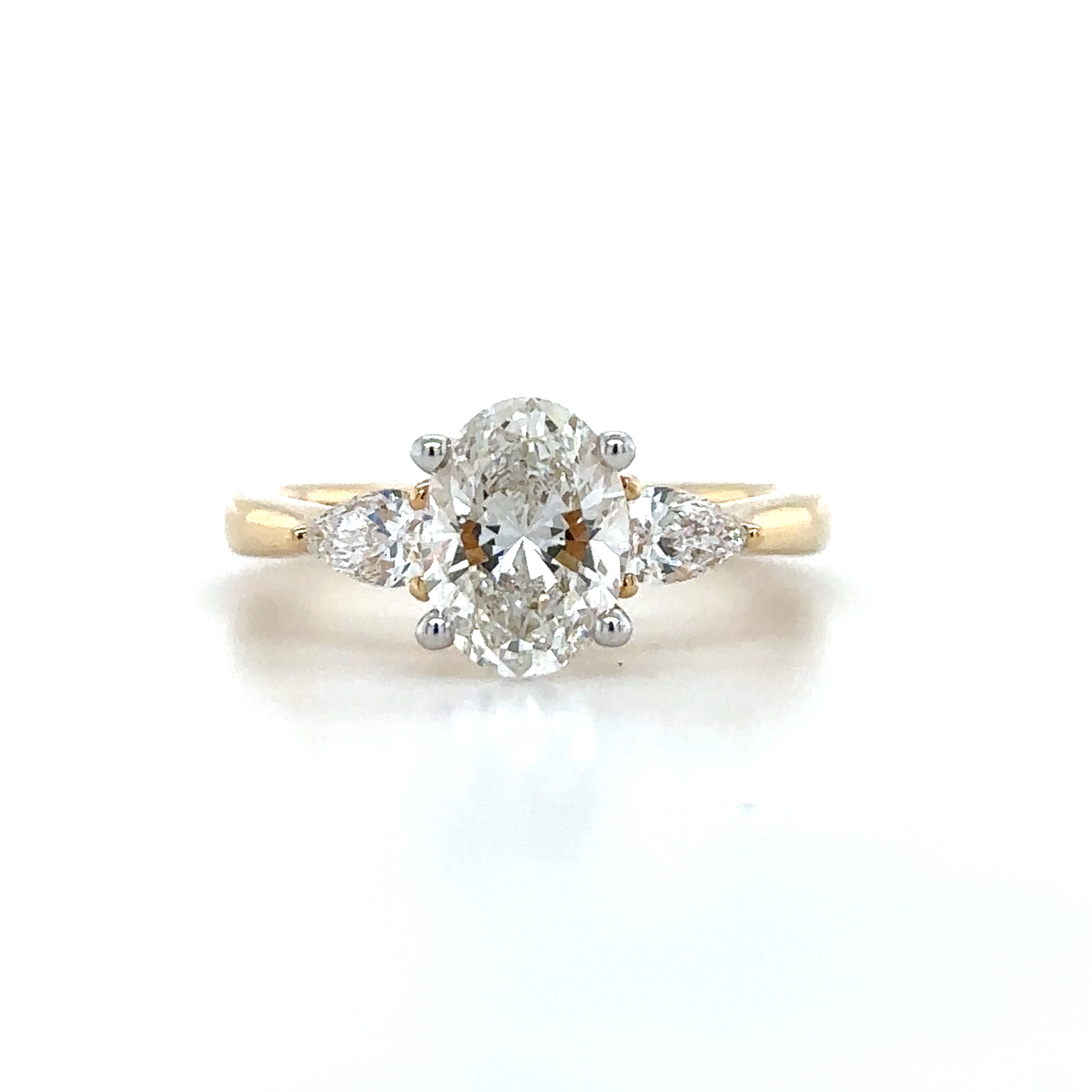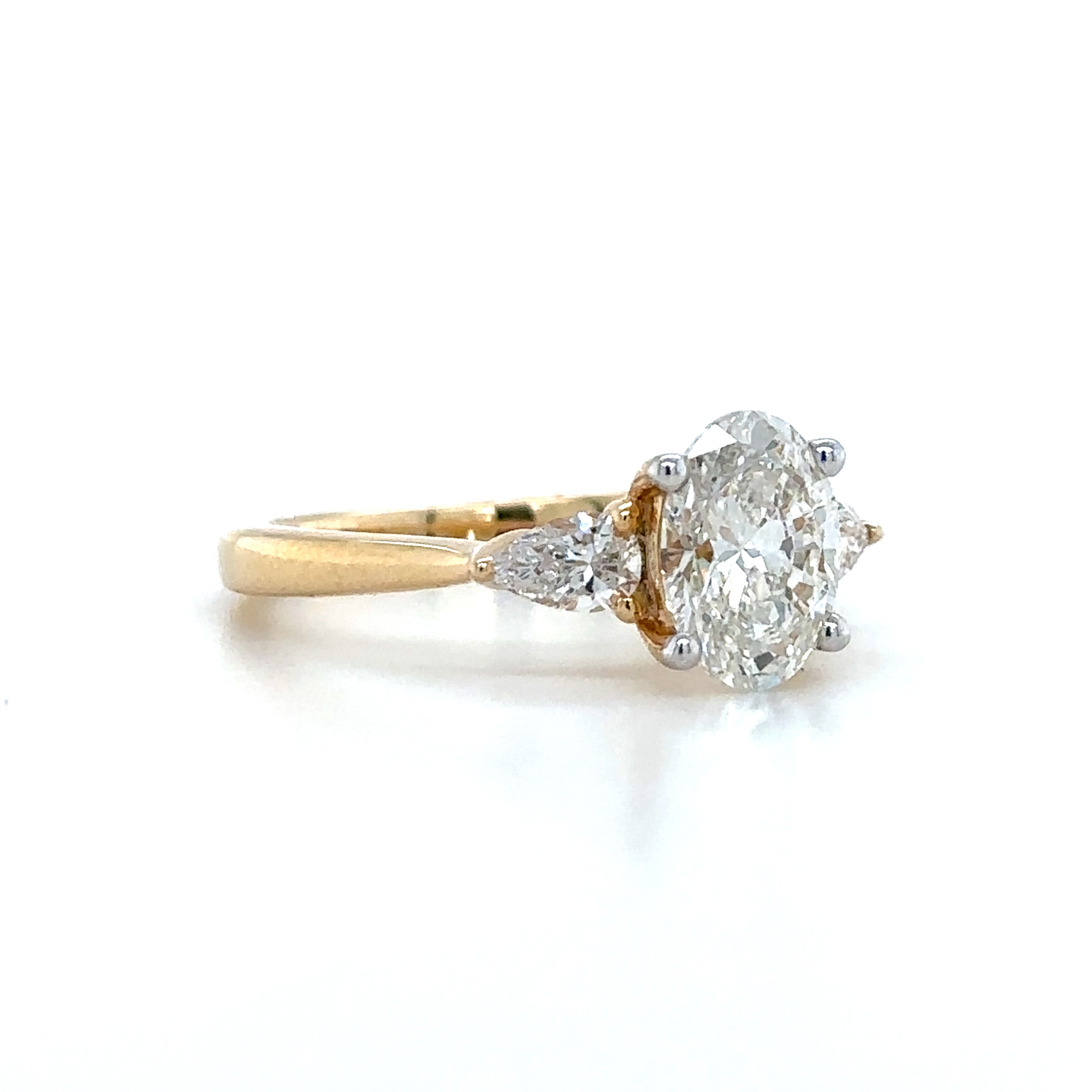 14K Yellow Gold Three-Stone Diamond Engagement Ring with Oval-shape center Lab Grown Diamond (1.38ct) F-G Color VS Clarity and set with 2 Pear-shape side Lab Grown Diamonds (0.50ctw) F-G Color VS Clarity. This ring's total carat weight is 1.88ctw.