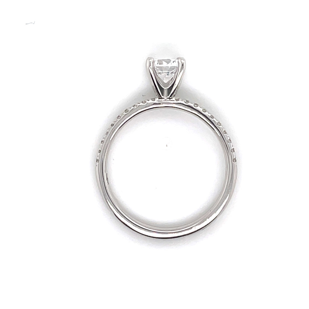 14K White Gold Side Stone Diamond Engagement Ring Setting designed to hold a 0.75 carat 5.8mmX5.8mm Round shape center stone and set with 20 Round-shape side Diamonds (0.20ctw) G-H Color I1 Clarity.