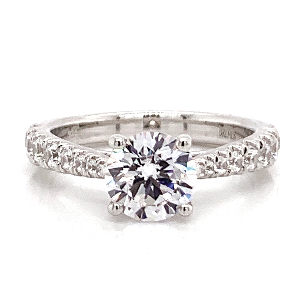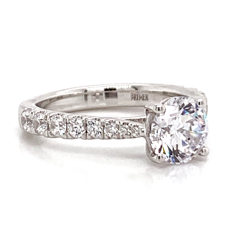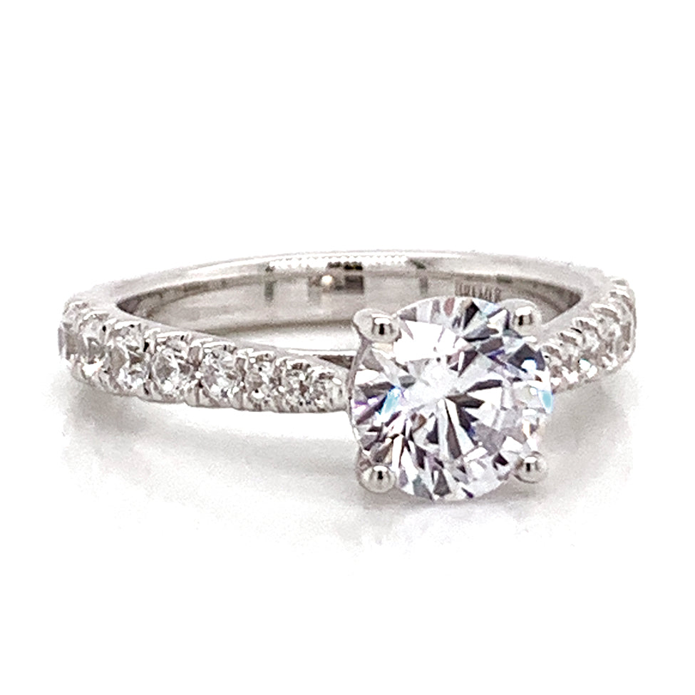 As classic as it comes! This simple engagement ring setting features a tapered string of diamonds set in white gold down the shoulder and is perfect for any wedding band. Ring is pictured with a 1.25-carat round diamond and is available to special order in platinum, rose gold, yellow gold and white gold to fit the diamond of your choice in your exact finger size.