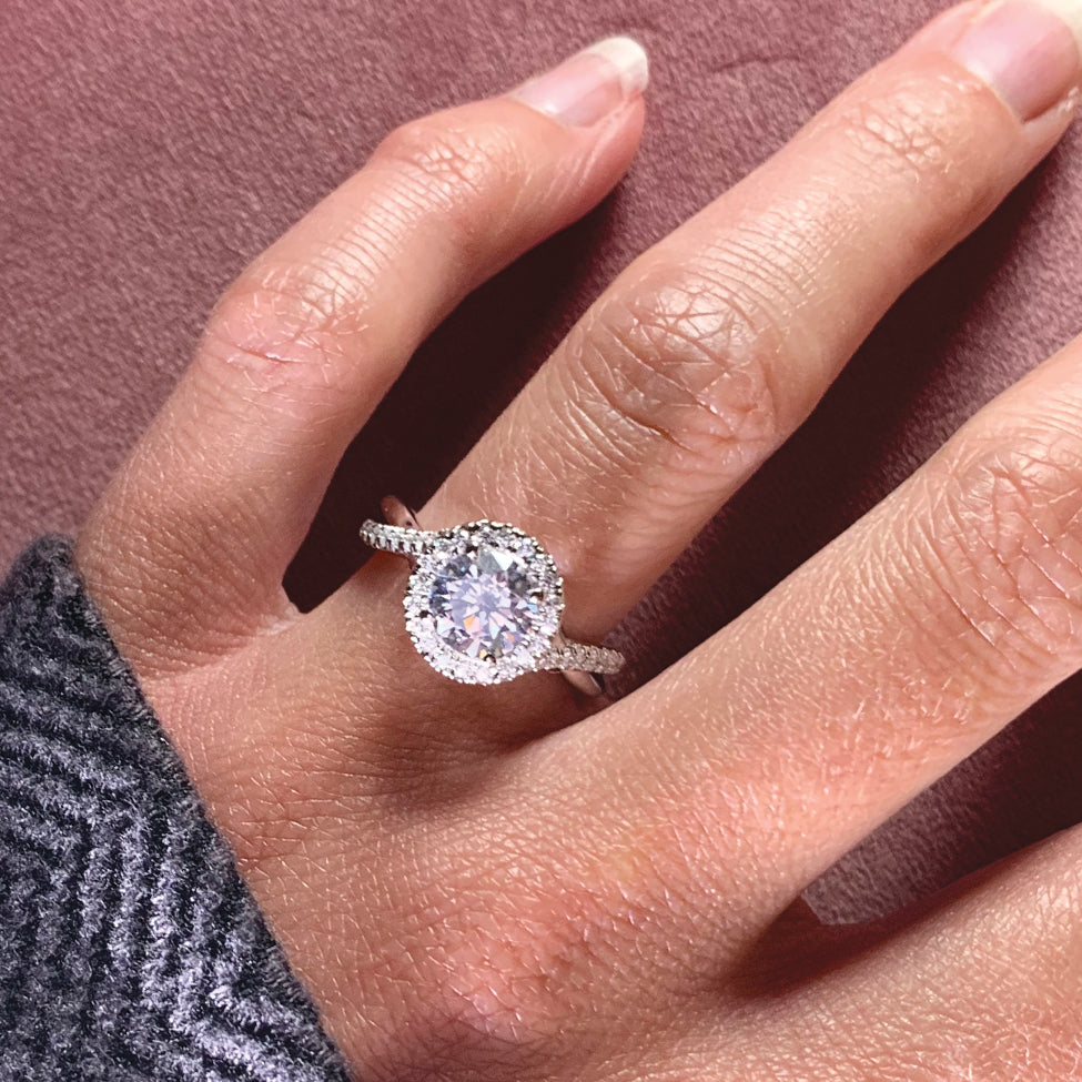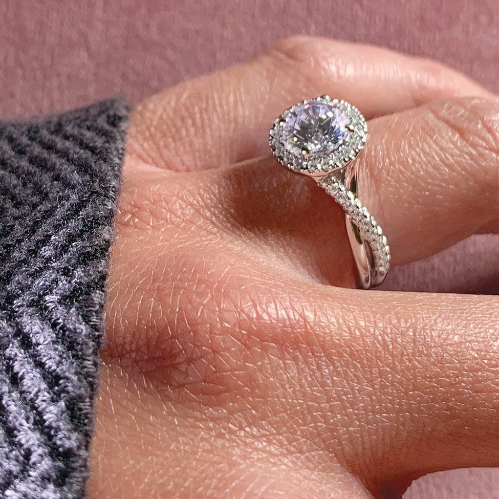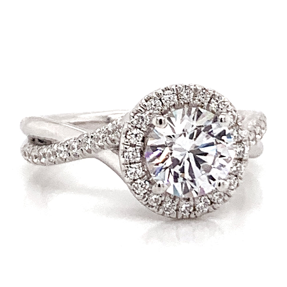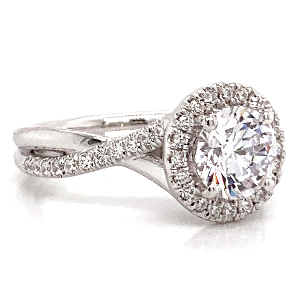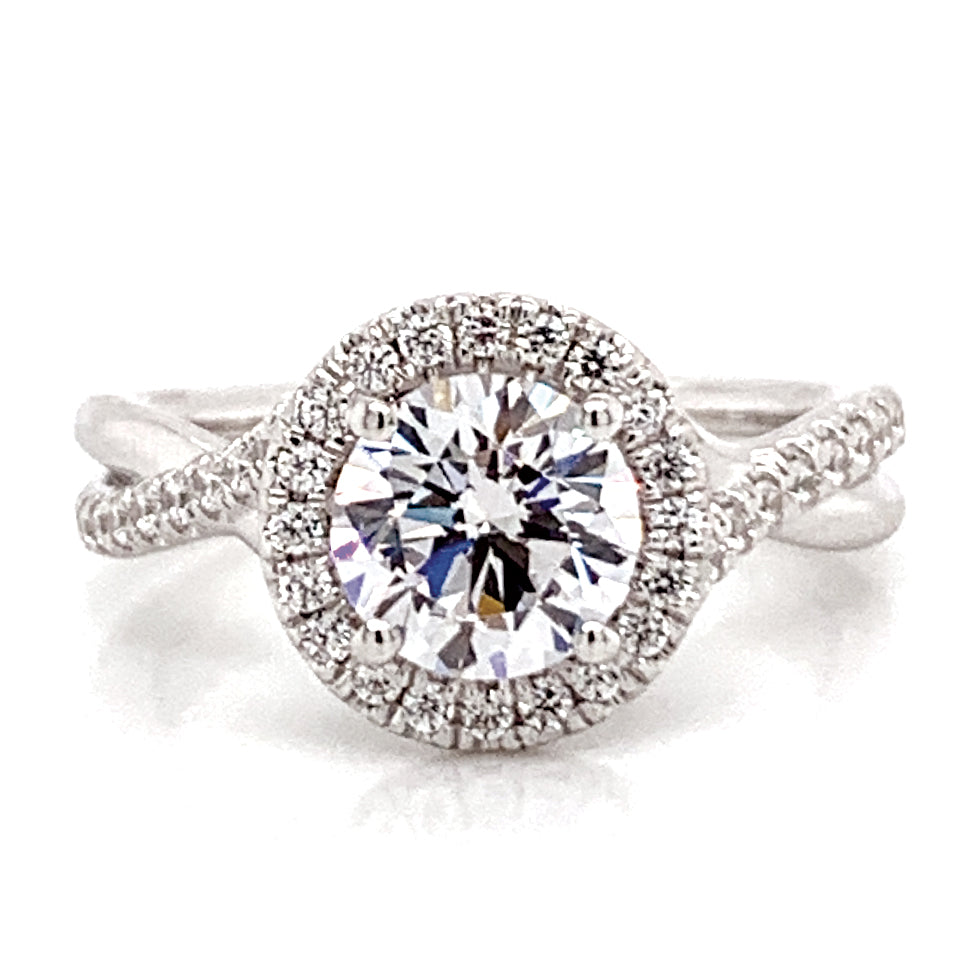 The perfect twist on a classic design! This halo diamond engagement ring setting features a petite diamond halo with a twist that has a string of diamonds and polished white gold. Ring pictured with a 1.25-carat round diamond center and is available to special order in platinum, rose gold, yellow gold and white gold to fit the diamond of your choice in your exact finger size.