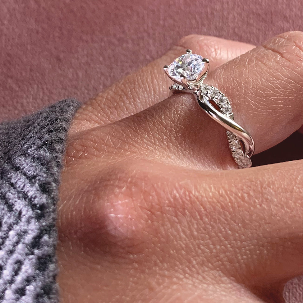 The more twists the better! This classic diamond engagement ring setting features a string of diamonds interlaced with a polished twist. Ring is featured with a 1-carat round diamond center. Available to special order in platinum, rose gold, yellow gold and white gold to fit the diamond of your choice in your exact finger size.