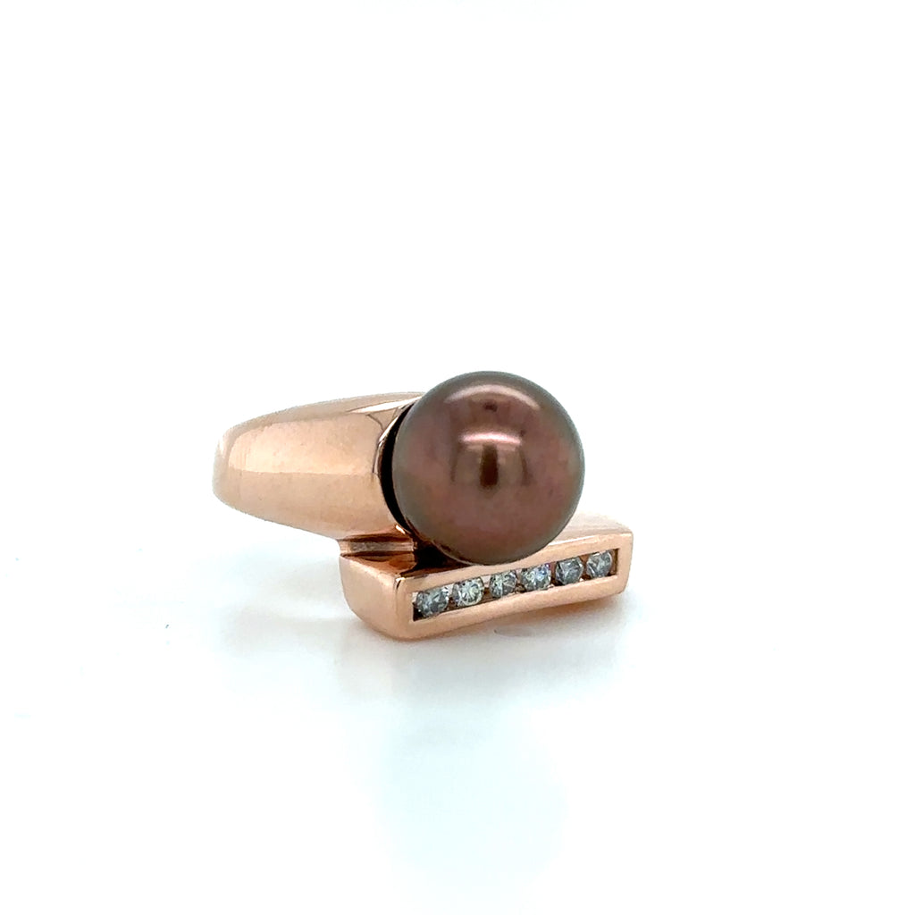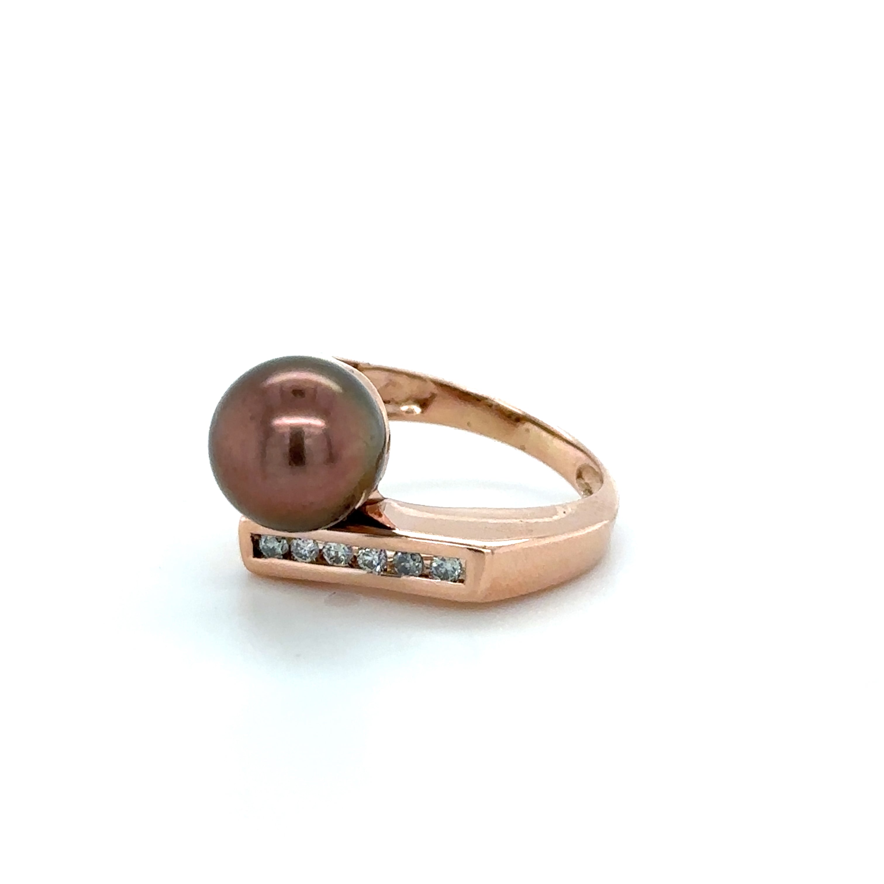 Estate 14K Rose Gold Bypass 9.2mm Freshwater Cultured Pearl Fashion Ring set with 1 Round-shape Pearl Brown Shades Color and set with 6 Round-shape side Diamonds (0.12ctw) J-K Color SI Clarity. This ring's total carat weight is .12ctw.