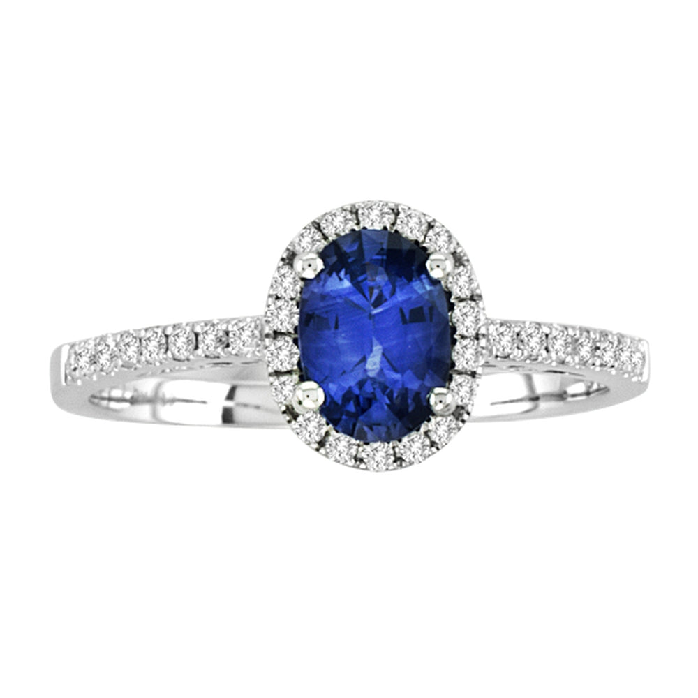 14K White Gold Halo Fashion Ring set with 1 Oval-shape Sapphire (1.13ctw) Blue Shades Color Round-shape side Diamond (0.25ctw) G-H Color SI Clarity. This ring's total carat weight is 1.38ctw.