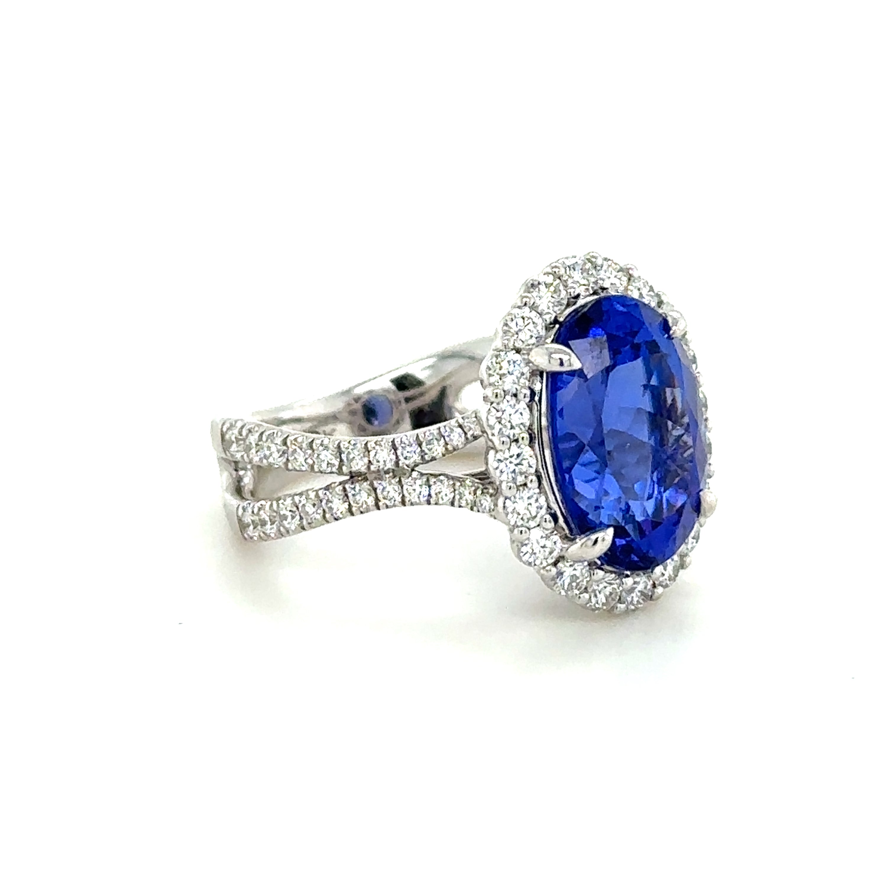 18K White Gold Halo Fashion Ring set with 1 Oval-shape Tanzanite (5.60ctw) Blue Shades Color Round-shape side Diamond (0.99ctw) . This ring's total carat weight is 6.59ctw.