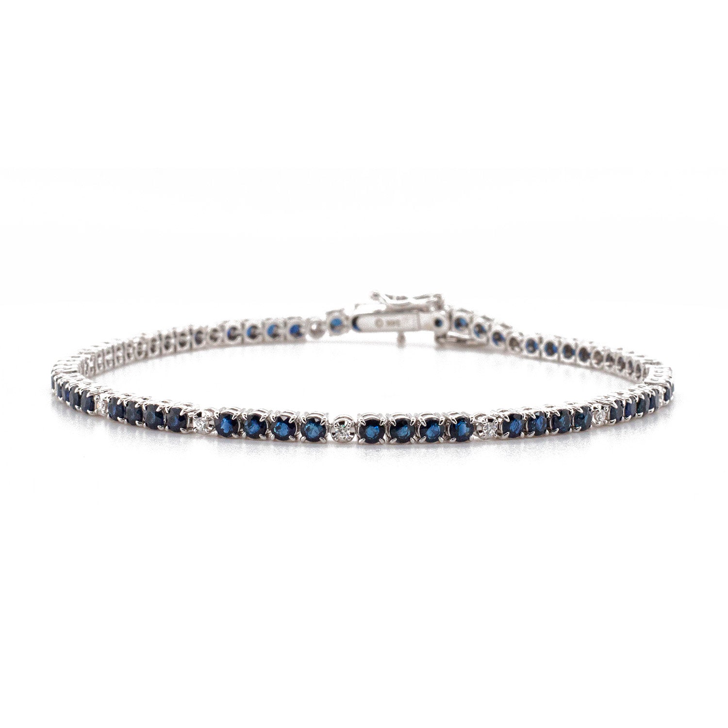 14K White Gold Tennis Gemstone Bracelet set with 60 Round-shape Sapphires Blue Shades Color and set with 14 Round-shape side Diamonds (0.10ctw) . This bracelet's total carat weight is 4.30ctw.