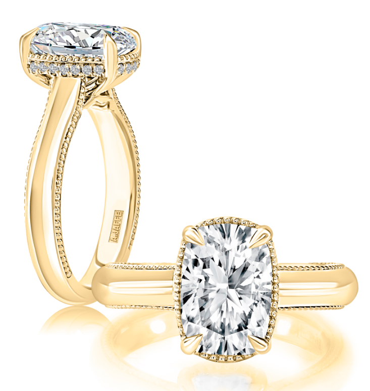 A. JAFFE 14K Yellow Gold Hidden Halo Diamond Engagement Ring Setting designed to hold a 3.00 carat Cushion shape center stone and set with 24 Round-shape side Diamonds (0.12ctw) G-H Color SI Clarity.