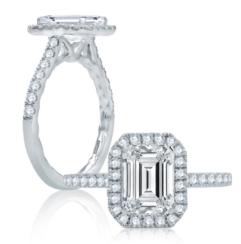 A. JAFFE 14K White Gold Halo Diamond Engagement Ring Setting designed to hold a 2.00 carat Emerald shape center stone and set with 36 Round-shape side Diamonds (0.53ctw) G-H Color SI Clarity.