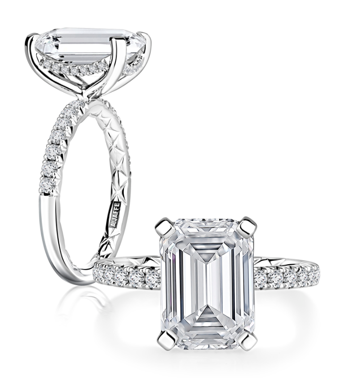 A. JAFFE 14K White Gold Hidden Halo Diamond Engagement Ring Setting designed to hold a 2.00 carat Emerald shape center stone and set with 32 Round-shape side Diamonds (0.38ctw) G-H Color SI Clarity.