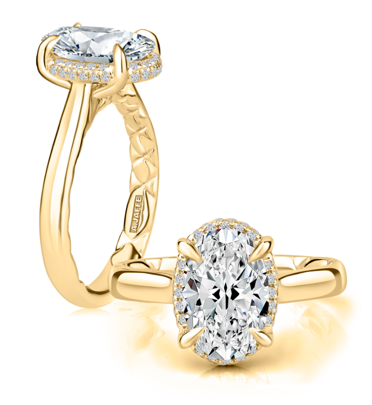 A. JAFFE 14K Yellow Gold Hidden Halo Diamond Engagement Ring Setting designed to hold a 3.00 carat Oval shape center stone and set with 48 Round-shape side Diamonds (0.19ctw) G-H Color SI Clarity.