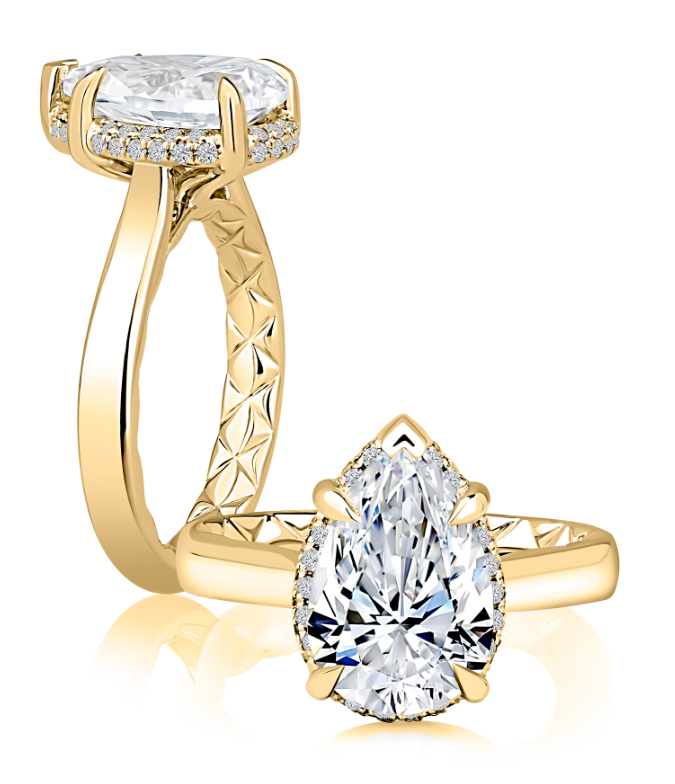 A. JAFFE 14K Yellow Gold Hidden Halo Diamond Engagement Ring Setting designed to hold a 3.00 carat Pear shape center stone and set with 39 Round-shape side Diamonds (0.20ctw) .