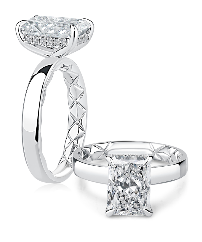 A. JAFFE 14K White Gold Hidden Halo Diamond Engagement Ring Setting designed to hold a 3.00 carat Radiant shape center stone and set with 20 Round-shape side Diamonds (0.10ctw) G-H Color SI Clarity.