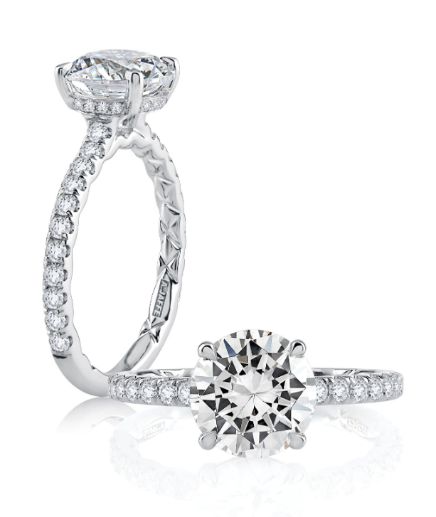 A. JAFFE 14K White Gold Hidden Halo Diamond Engagement Ring Setting designed to hold a 2.00 carat Round shape center stone and set with 36 Round-shape side Diamonds (0.44ctw) G-H Color SI Clarity.