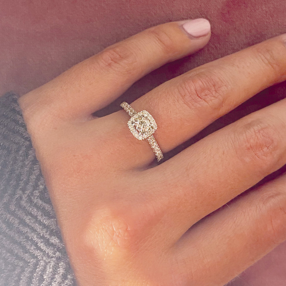 This ring is a size 7 and is ready for you today. Sizing is available (up/down one size) in our stores for this one of a kind Proposal Ready Ring. If sizing is required, this engagement ring may be ready for that special proposal in just 7-10 days.