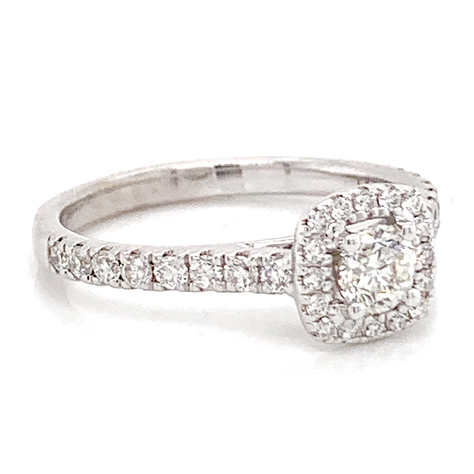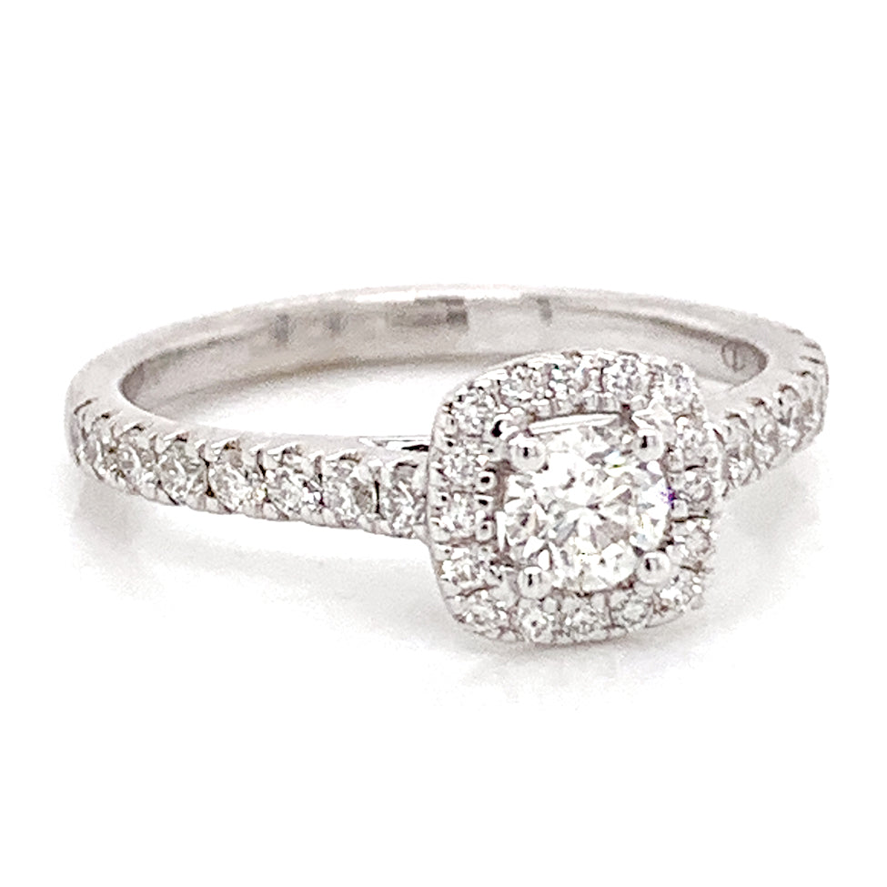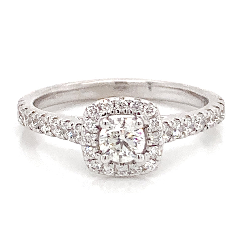 Bremer Jewelry 14K White Gold Halo Diamond Engagement Ring with Round-shape center Diamond (0.30ct) G-H Color SI Clarity Round-shape side Diamond (0.45ctw) G-H Color SI Clarity. This ring's total carat weight is 0.75ctw.