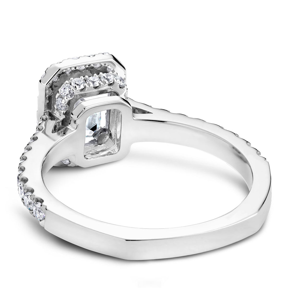 Each Noam Carver engagement ring setting is designed with impeccable attention to every detail, navigating the delicate balance of timeless designs with intriguing allure. This classic, halo engagement ring setting features glistening round diamonds set into an emerald cut halo design around the center diamond with diamonds down the sides. Each ring can be customized to fit your finger size, metal preference, center gemstone size and shape, as well as modified in design to fit your exact specifications. Shown here with a one-carat emerald cut replacement stone in 14k white gold and 0.55ctw diamonds. Noam Carver, an ode to the past with an eye for tomorrow. Each Noam Carver engagement ring pairs with an exact matching wedding band.