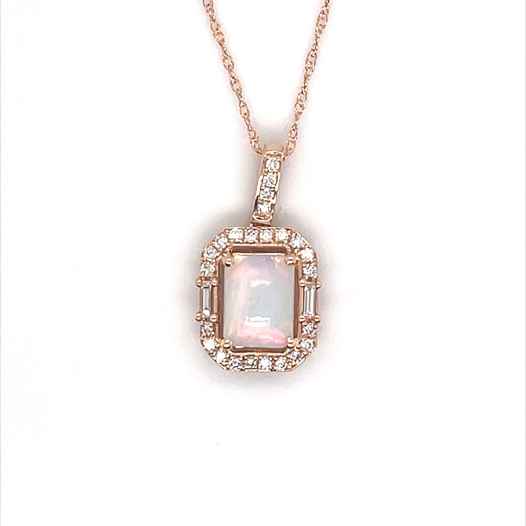 Bremer Jewelry 14K Rose Gold Halo Pendant set with 1 Cushion-shape Opal (0.95ctw) Round-shape side Diamond (0.27ctw) H-I Color I1/I2 Clarity on a 14K Rose Gold Link Necklace. This necklace's total carat weight is 1.22ctw.