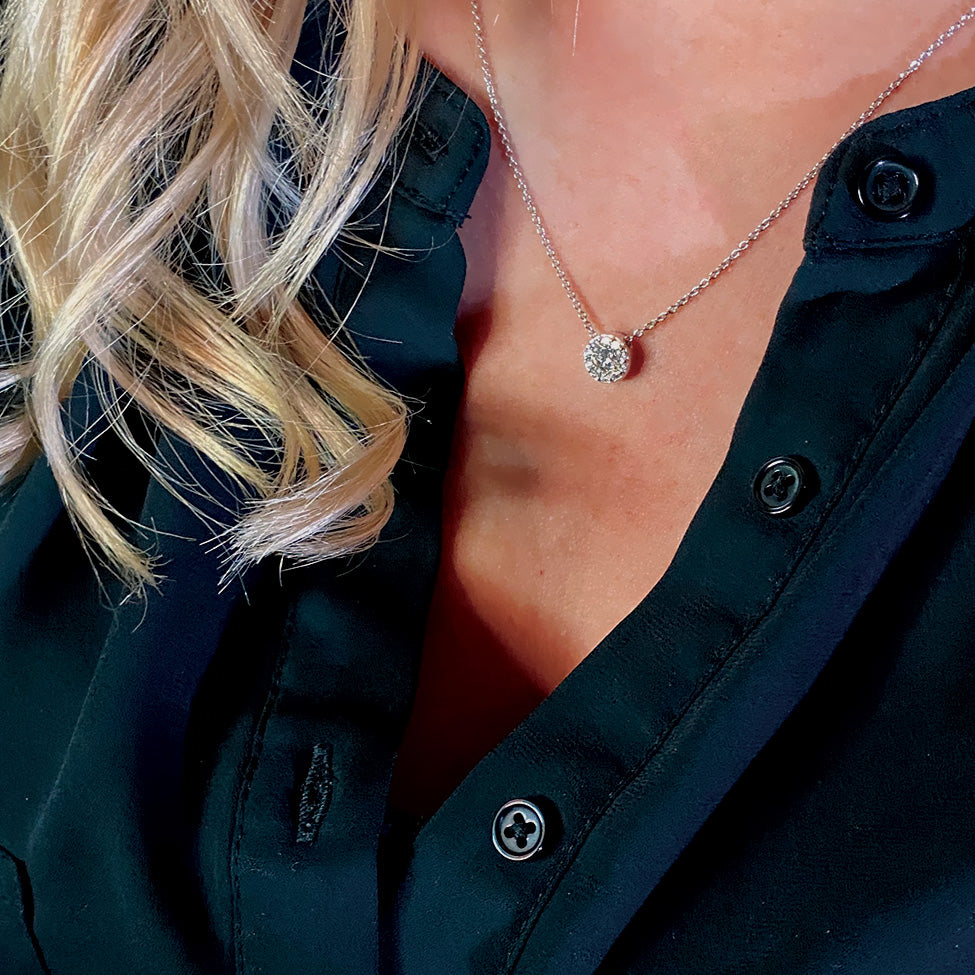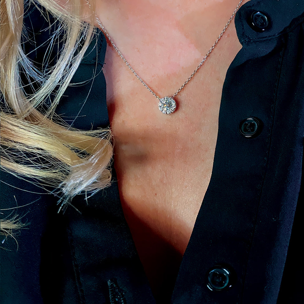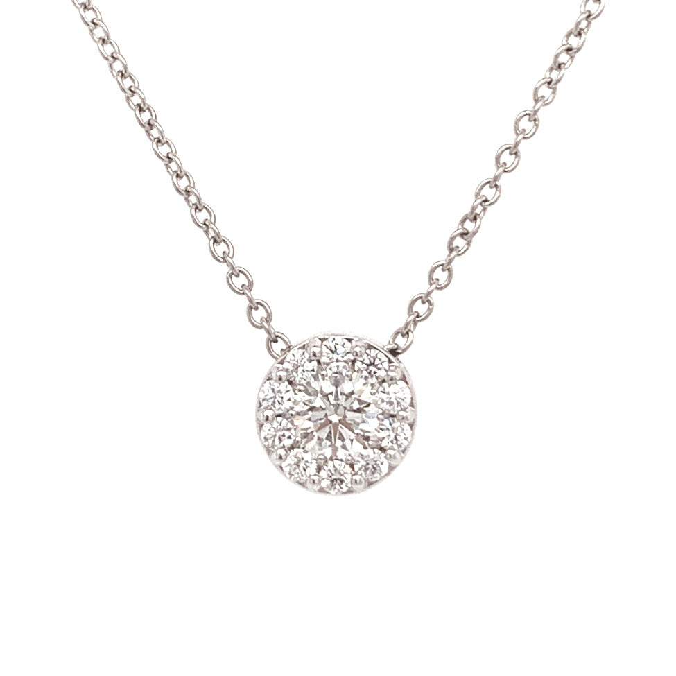 Hearts On Fire 18K White Gold Cluster Fulfillment Pendant set with 11 Round-shape Diamonds (0.46ct) I-J Color SI Clarity . This necklace's total carat weight is .46ctw.