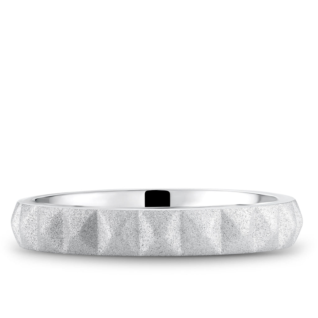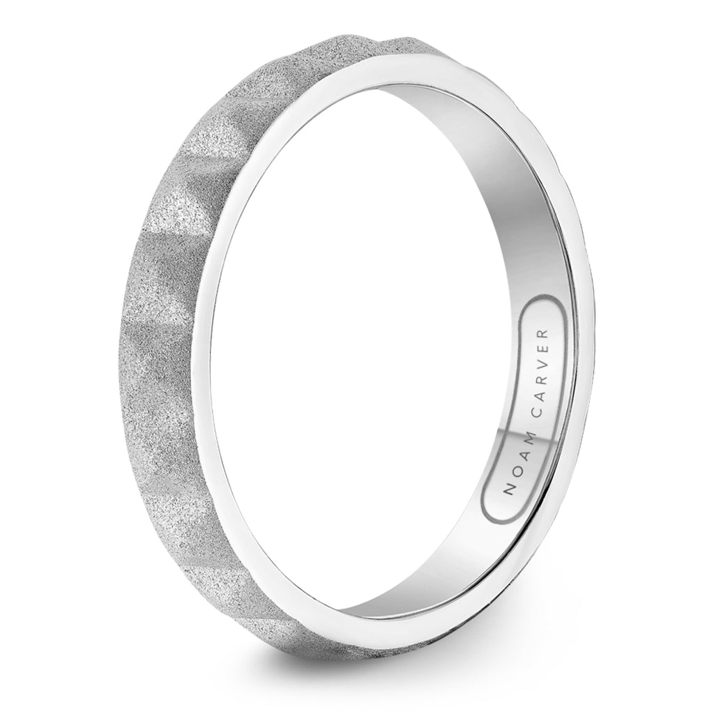 The Noam Carver mens wedding band collection is like no other! The sophistication and designs make it stand out from just an average wedding band. This 14k white gold wedding band features a frosted top design. This ring is priced in 14k white gold and in a 4mm width. This is available to special order in your exact finger size and in yellow gold, rose gold or platinum.