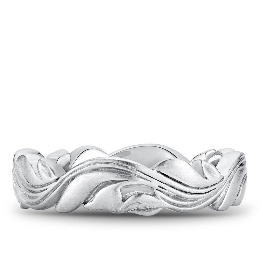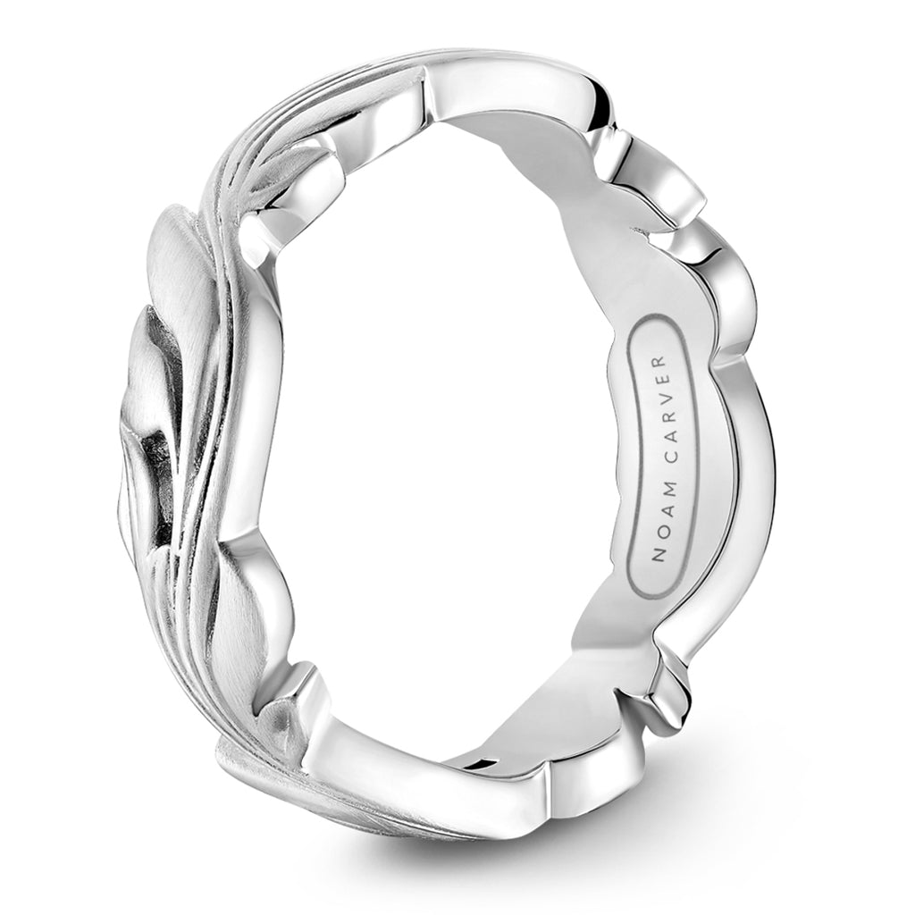 The Noam Carver mens wedding band collection is like no other! The sophistication and designs make it stand out from just an average wedding band. This 14k white gold wedding band features a frosted filigree design. This ring is priced in 14k white gold and in a 6mm width. This is available to special order in your exact finger size and in yellow gold, rose gold or platinum.