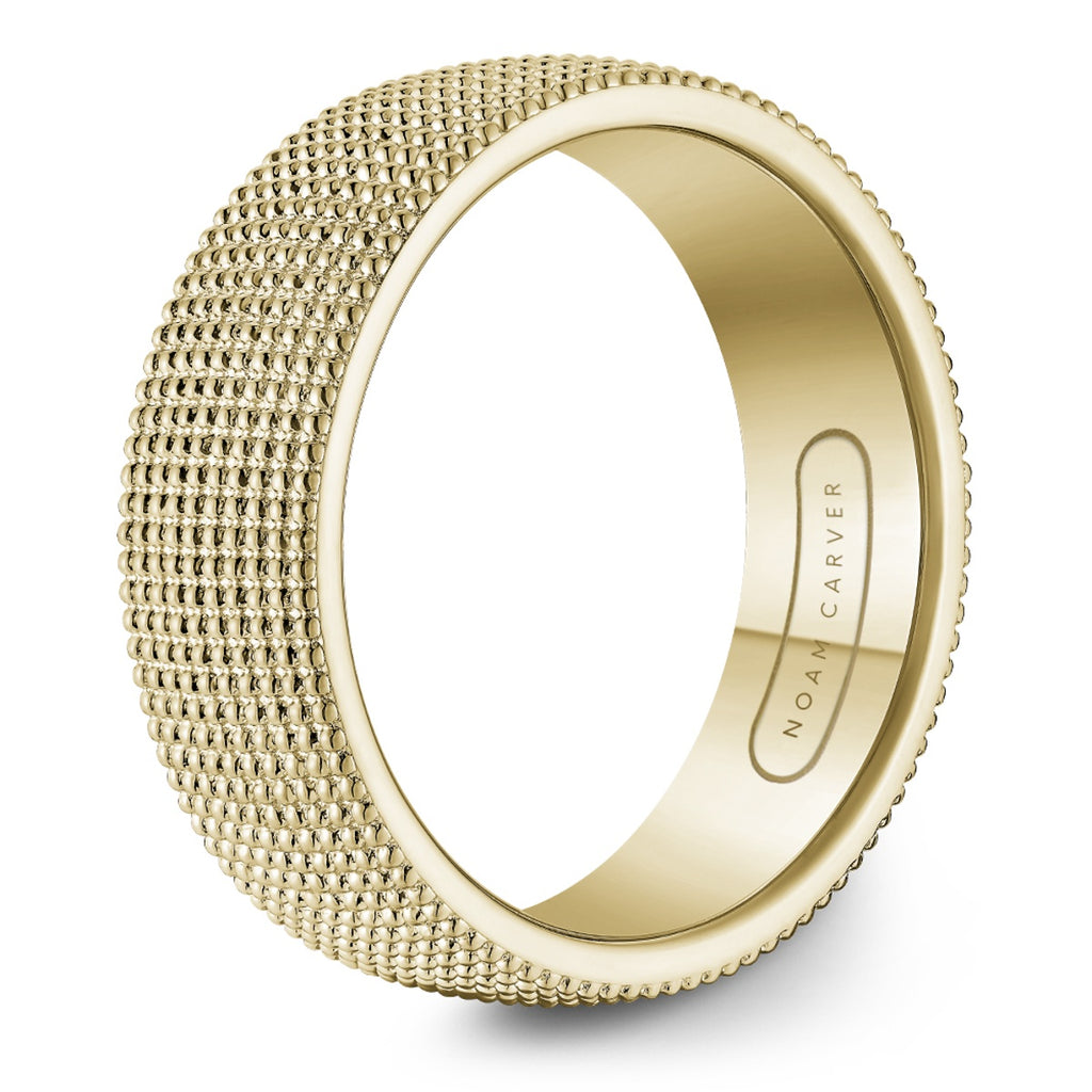 The Noam Carver mens wedding band collection is like no other! The sophistication and designs make it stand out from just an average wedding band. This 14k yellow gold wedding band features a beaded design with a high polish interior. This ring is priced in 14k yellow gold and in a 7.5mm width. This is available to special order in your exact finger size and in white gold, rose gold or platinum.