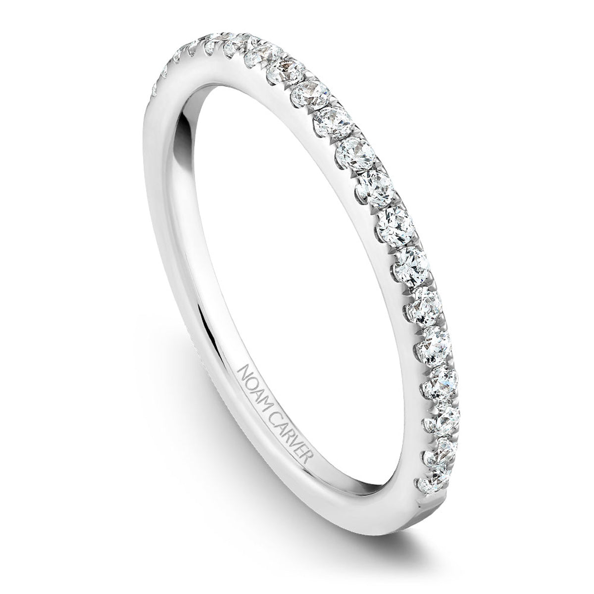 Each Noam Carver wedding band is designed with impeccable attention to every detail, navigating the delicate balance of timeless designs with intriguing allure. This classic, thin diamond wedding band has glistening round diamonds in a straight design. Each ring can be customized to fit your finger size, metal preference, as well as modified in design to fit your exact specifications. Shown here with in 14k white gold and 0.34ctw. Noam Carver, an ode to the past with an eye for tomorrow.