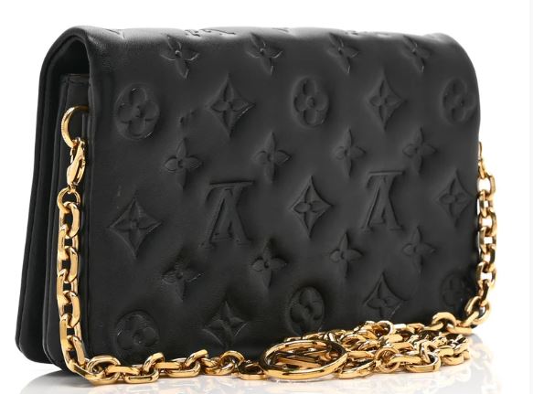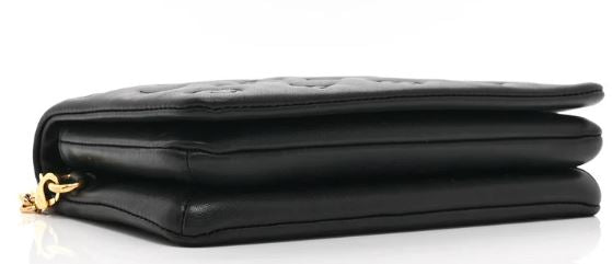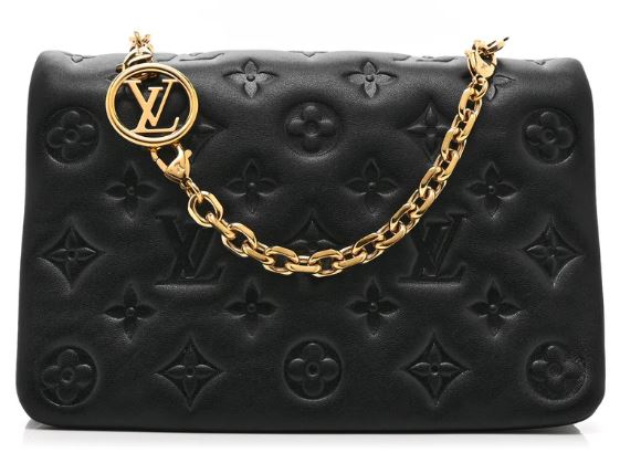 Pre-Owned Louis Vuitton Pochette Coussin BB Black. This bag is crafted from monogram embossed soft lambskin. It features a removable chain with a Louis Vuitton charm, and gold-tone hardware. The front flap opens to a partitioned orange microfiber interior with a zipper compartment and a patch pocket.