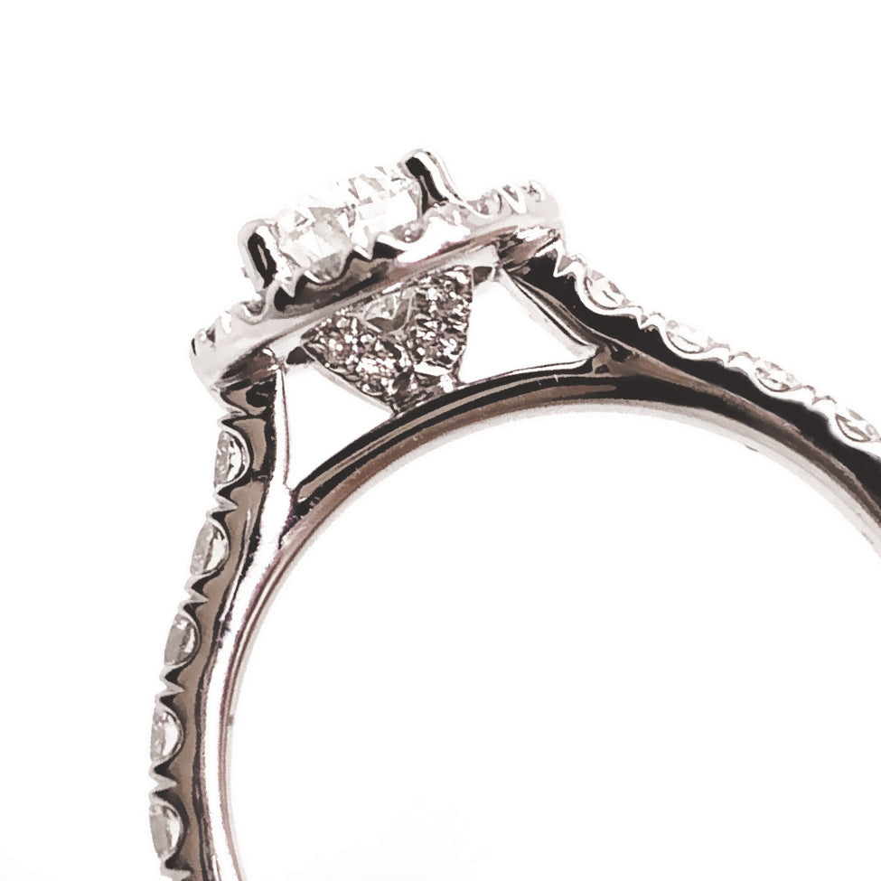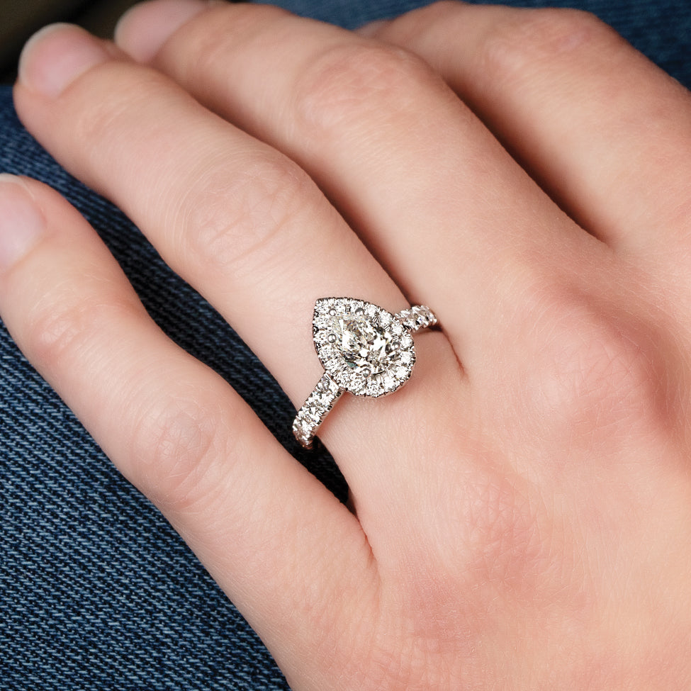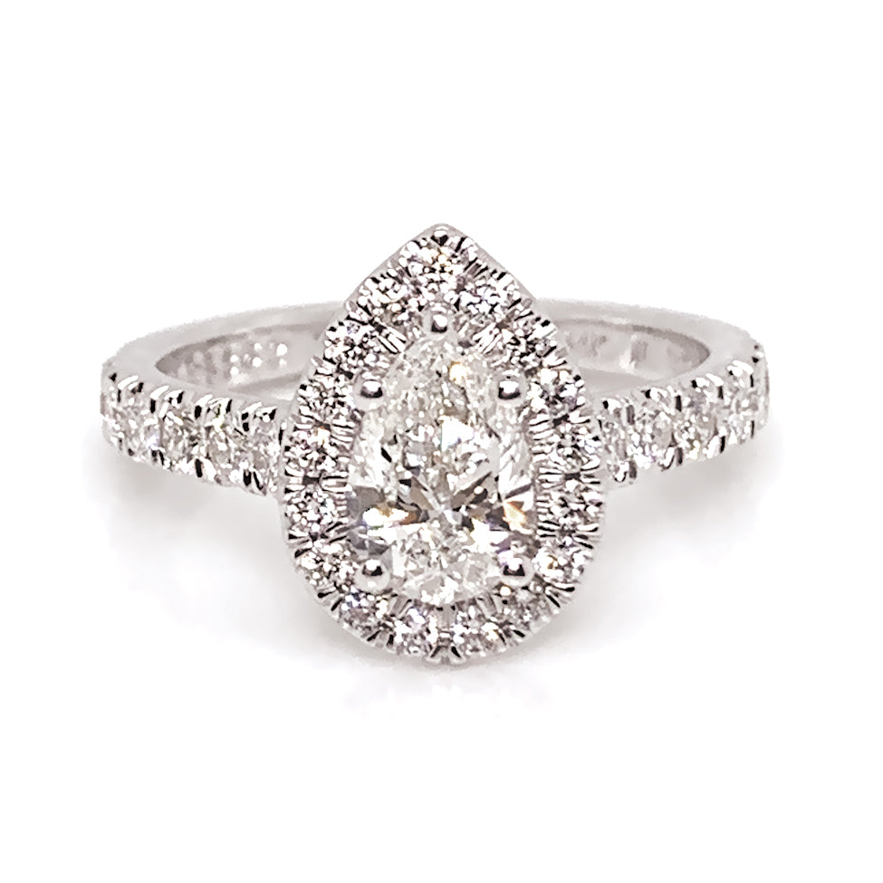 Bremer Jewelry 14K White Gold Halo Diamond Engagement Ring with Pear-shape center Diamond (0.80ct) D Color SI2 Clarity and set with 40 Round-shape side Diamonds (0.73ctw) H-I Color SI2 Clarity. This ring's total carat weight is 1.53ctw.