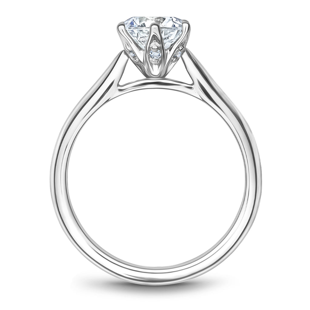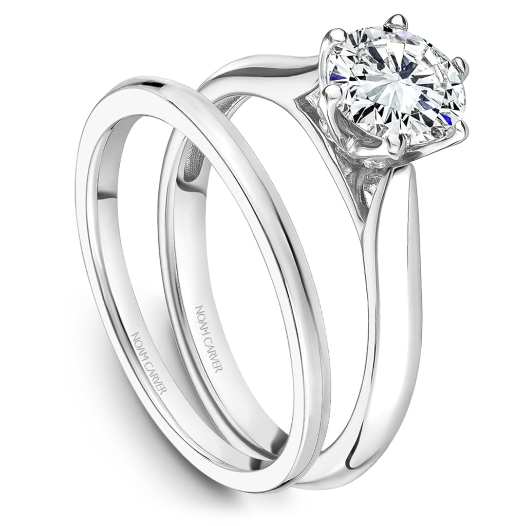 Each Noam Carver engagement ring setting is designed with impeccable attention to every detail, navigating the delicate balance of timeless designs with intriguing allure. This classic solitaire features a six-prong setting that has diamonds under the prongs and polished sides. Each ring can be customized to fit your finger size, metal preference, center gemstone size and shape, as well as modified in design to fit your exact specifications. Shown here with a two-carat round replacement stone in 14k white gold and 0.07ctw diamonds. Noam Carver, an ode to the past with an eye for tomorrow. Each Noam Carver engagement ring pairs with an exact matching wedding band.