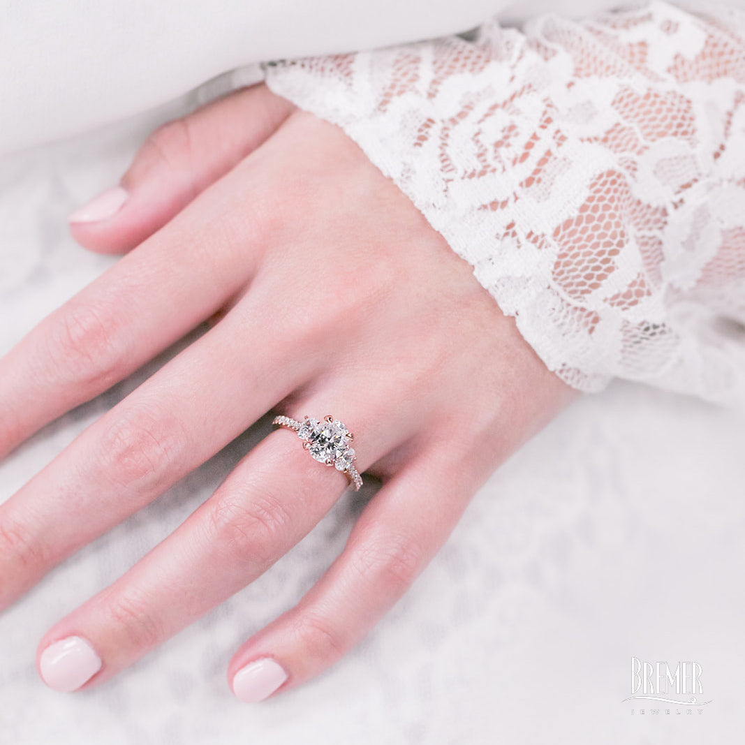 Each Noam Carver engagement ring setting is designed with impeccable attention to every detail, navigating the delicate balance of timeless designs with intriguing allure. This classic, Atelier ring features a round diamond on each side of the center diamond and glistening white diamonds down the sides. Each ring can be customized to fit your finger size, metal preference, center gemstone size and shape, as well as modified in design to fit your exact specifications. Shown here with a two-carat round replacement stone in 14k white gold and 0.76ctw diamonds. Noam Carver, an ode to the past with an eye for tomorrow. Each Noam Carver engagement ring pairs with an exact matching wedding band.