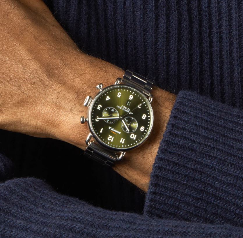 Canfield 2 Eye Canfield Chrono 43mm Stainless Bracelet. Built using top loaded case construction, the Canfield Chronograph features an open dark olive dial that showcases refined minute track and slim, diamond-cut hands. Finished with stainless steel case and bracelet, this is sophistication achieved through simplicity.