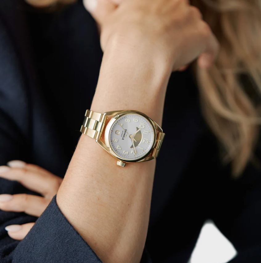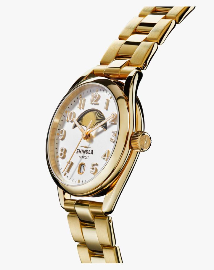 Shinola Derby Day & Night Watch 38MM Yellow Stainless Steel Watch. Introducing the horseshoe-inspired classic, now with an even bigger kick—the scaled-up 38mm Derby with a calendar aperture, Day & Night window, and engravable caseback. Relaxed yet polished, the Derby is finely crafted for a timeless, everyday look. This first-ever Day & Night Derby features a celestial movement tracking window and a calendar aperture. Take a close look at the moon and stars—they glow with Super-LumiNova. Front and center: The polished PVD gold stainless steel case that wraps elegantly around the clean and open dial. It’s a seamless design executed with fresh inspiration from American design heritage. Slim hands and applied indexes on the dial complete the style. Derby is no show pony—it’s built to last, with a design that thinks in decades, not seasons.