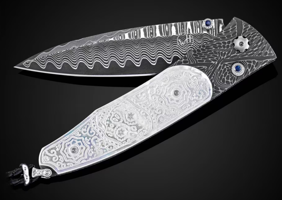 The Gentac ‘Sugar Skull’ features a frame of hand-forged 'Mind Melt' damascus by Chad Nichols, and hand-carved Mother of Pearl scales by Lee Downey. The blade is 'Wave' damascus with an extra strong core of VG-10. The one-hand button lock and the thumb stud are set with sapphires. An exceptional design that offers rigorous performance in a sleek, comfortable knife, the Gentac is also the perfect canvas to showcase William Henry’s range of exotic materials and techniques. The ‘Sugar Skull’ features the craftsmanship, hi-tech, and forged metals that are the hallmark of William Henry's collections; a distinctive personality statement to be worn and used for a lifetime.