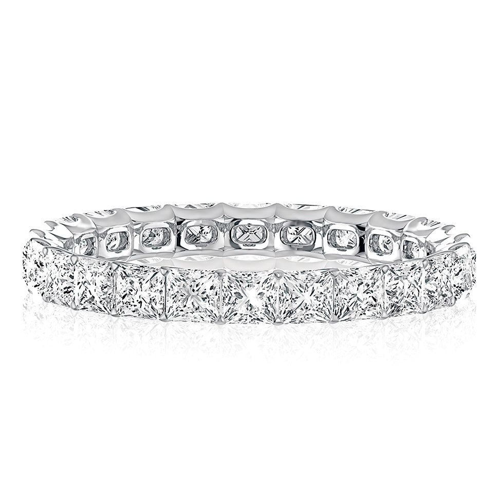 Encircle your entire finger in spectacular princess cut diamonds with this timeless, diamond eternity ring that’s perfect for a wedding band or anniversary surprise. The “starting at” price is listed above. All A. Jaffe Eternity Rings are crafted specifically for you, so pricing varies based on finger size, metal type, and total diamond carat weight (special order time varies 4-6 weeks). Visit our stores to try on over 60 eternity band models, then customize your very own for a perfect fit! Picture here shows the 2.40 ctw version in a finger size 7.