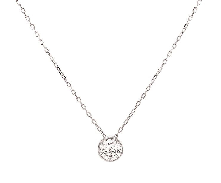 Bremer Jewelry designed Round Diamond Bezel Pendant set in 14K White Gold (0.55ct) H-I Color SI Clarity. This pendant is presented on an 18" adjustable Cable Link Chain.