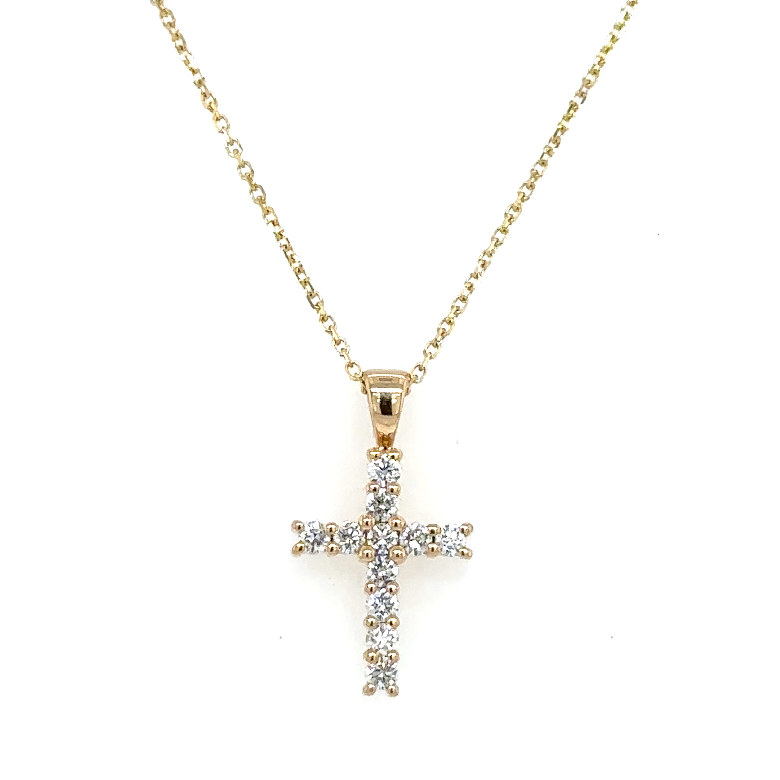 14K Yellow Gold Cross Pendant with 14K Yellow Gold Cable Link Necklace set with Round-shape Diamond H-I Color SI Clarity . This necklace's total carat weight is .25ctw.