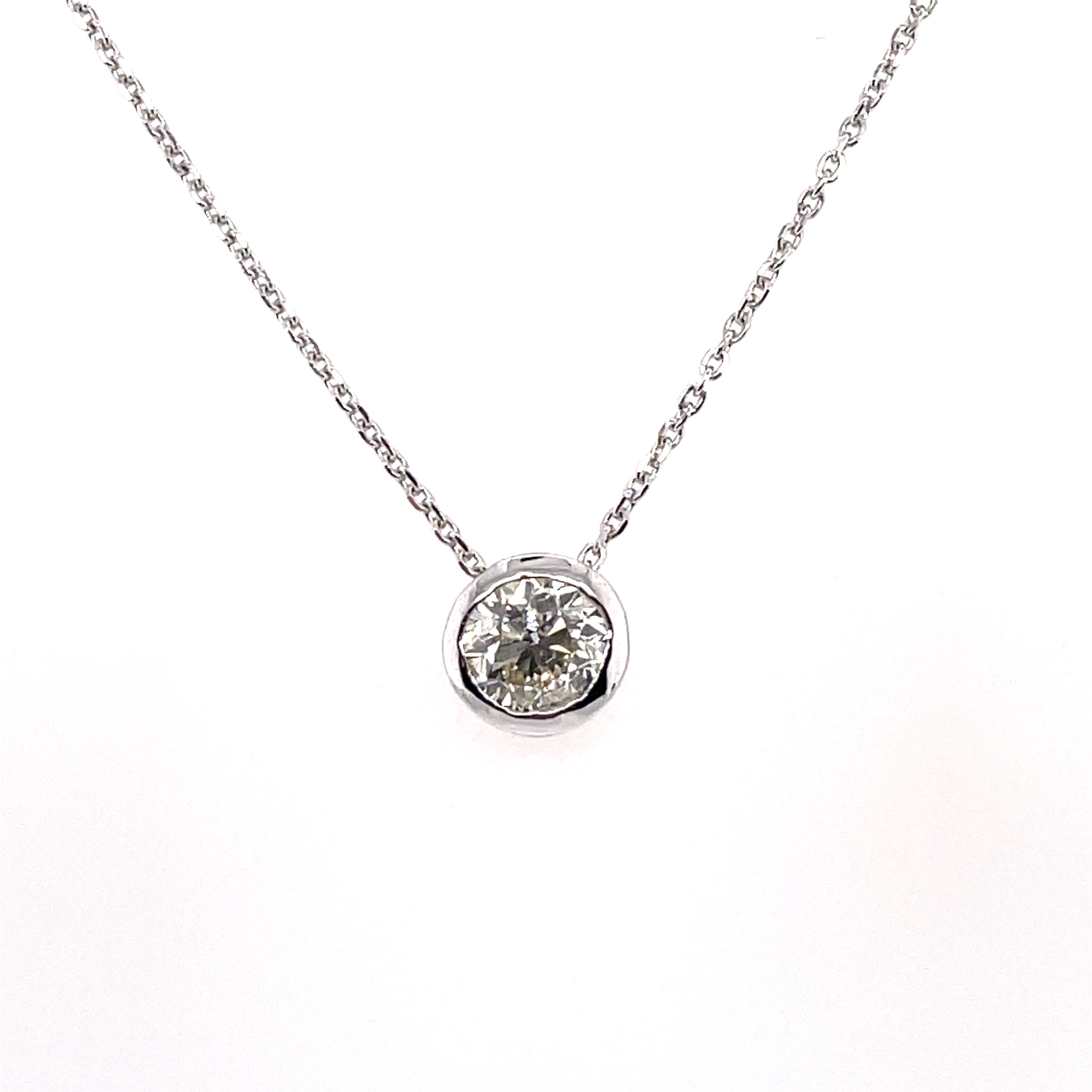 18K White Gold Necklace set with 1 Round-shape Diamond (0.51ct) H-I Color SI Clarity . This necklace's total carat weight is .51ctw.