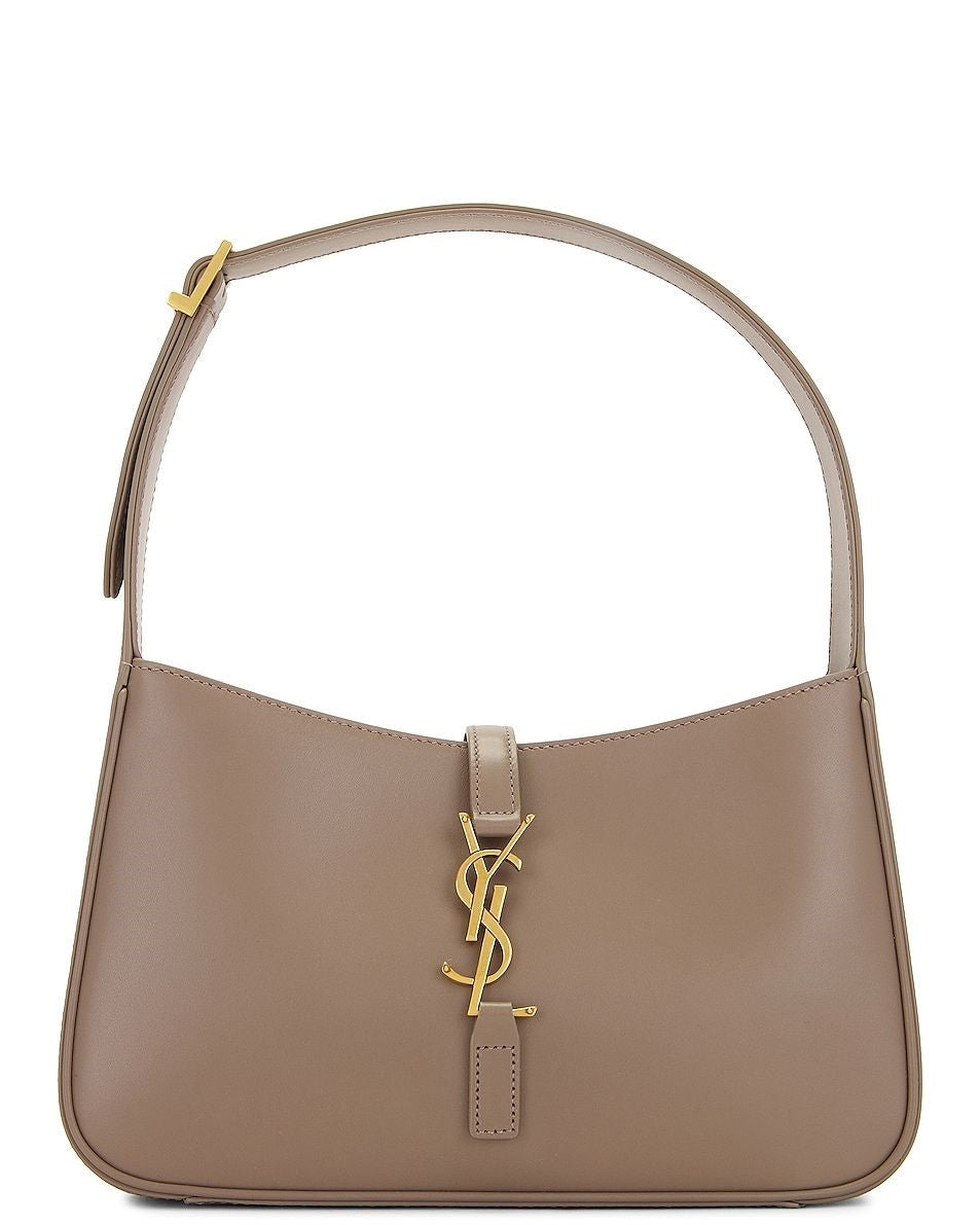 Pre-Owned-YSL Flap Pouch Bag. Leather with suede lining and broze-tone hardware. Open op with interlaced YSL hook closure, one main compartment with single sip pocket. Adjustable shoulder strap that measures approx. 9.5"W x 6"H x 2.5"D . Shoulder strap with a 6" drop, Color is Neuro. Made in Italy