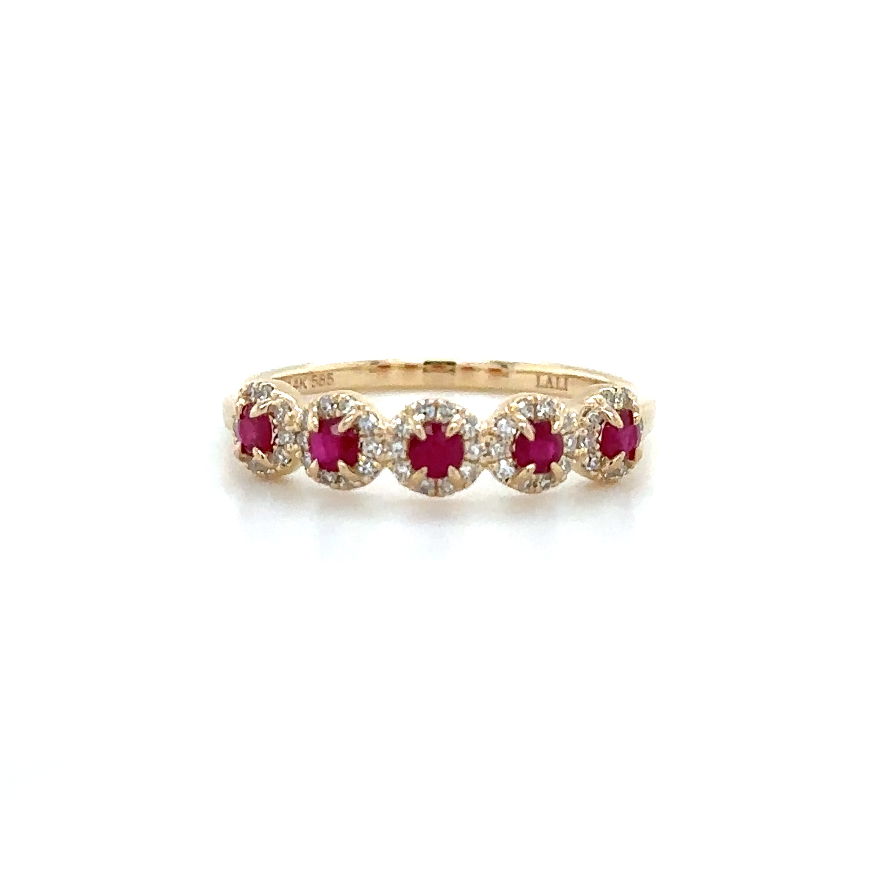 14K Yellow Gold Five Stone Fashion Ring set with 5 Round-shape Rubies (0.33ctw) Round-shape side Diamond (0.15ctw) . This ring's total carat weight is .48ctw.